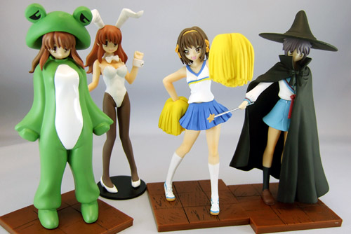 これは、キャラアニの商品説明によると「キャラアニが贈る、新コンセプトフィギュア!SOS団の3人娘が、劇中に登場する様々なコスチュームで完成品フィギュアになりました。おまけパーツで、さまざまなポーズ替えや衣装替えが楽しめます。キャラアニ限定特典として同サイズのみくるバニーフィギュア(白)が付いてくる!」と紹介されています。