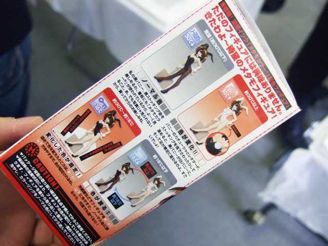 Amazonの商品説明によると「期待の仕様『メタモフィギュア』に、決定版的造型のバニーハルヒが!圧倒的なバリューで登場です。作品に忠実なカラーリングの黒バニーを、あなたの手でオリジナルカラーの白バニーに!ストッキングも素足にチェンジできます。アイデア次第で自分だけのオリジナルカラーリングで飾ることが出来ます!アニメの設定を突き詰めた顔部の表現のみならず、ハルヒの健康的なボディラインを余すことなく立体化!温度で色が変わる、温感フィギュア!温めると(約30℃以上)、カラーリングが変化します。約16℃以下に冷やすと、カラーリングが初期化され、色が戻ります。」と紹介されています。(会場で展示されていた色変更参考画像)