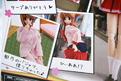 掲示されていたPOPでは、ケープをまとった姿や、郁乃のパジャマを着た姿、ブルマをはいた例のシーンの再現画像などが掲載されていましたw