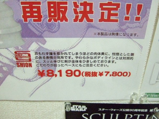「しおん」は、POPの商品説明によると「おもわず瞳を惹かれてしまうほどの肉体美に、恍惚とした艶のある表情が見所です。やわらかなボディラインとは対照的に、スッと伸びた剣が全体をひきしめております。こだわりが詰ったベースにもご注目ください。」という、ポリストーン製の完成品半身像となるものです。全高約180mmで、価格は税込8,190円。