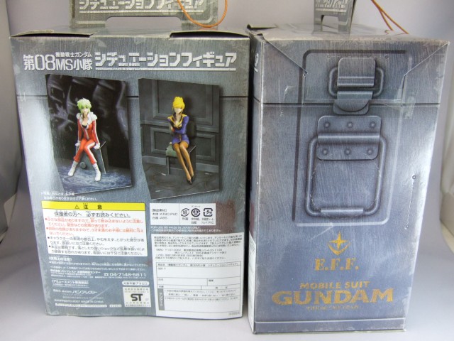 バンプレストプライズ「機動戦士ガンダム第08MS小隊 シチュエーションフィギュア」(RA)のパッケ表裏、側面。おそらく弾薬箱をイメージした感じ。それと告知用ポスター。