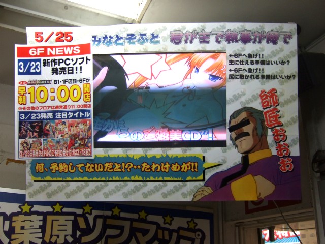 3月20日、公式でも公開が開始している、エロゲ「つよきす」の企画&シナリオを担当されたタカヒロ氏が立ち上げたみなとそふとの第1弾で、すでにアニメ化も決まっている「君が主で執事が俺で」(AA)の「特典通知用おまけデモ」が、ソフマップ本店にて放映開始されてます。中の人っぽい声も収録されているからか「師匠ぉぉぉ」として東方不敗っぽい人のイラストを掲示w