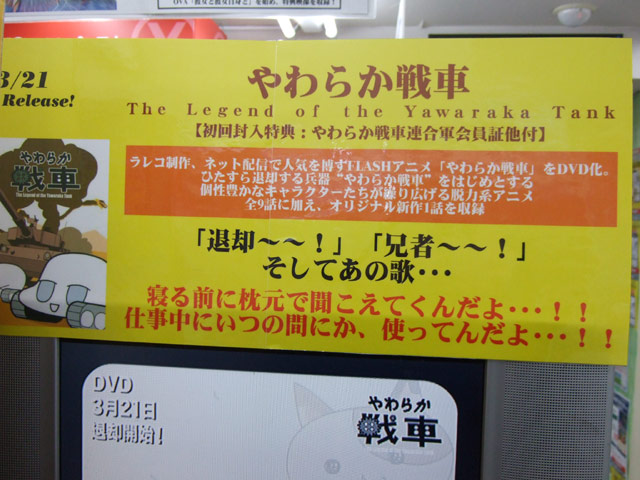 ラレコ制作、ネット配信で人気を博すFLASHアニメ「やわらか戦車」をDVD化。ひたすら退却する兵器“やわらか戦車”をはじめとする個性豊かなキャラクターたちが繰り広げる脱力系アニメ。全9話に加え、オリジナル新作1話を収録。(やわらか戦車 – Wikipedia)