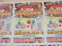 これは、3000、5000、10000、20000円の買い物をしたお客に、それぞれのランクの棚の商品から1つをもれなくプレゼントするというフェア。