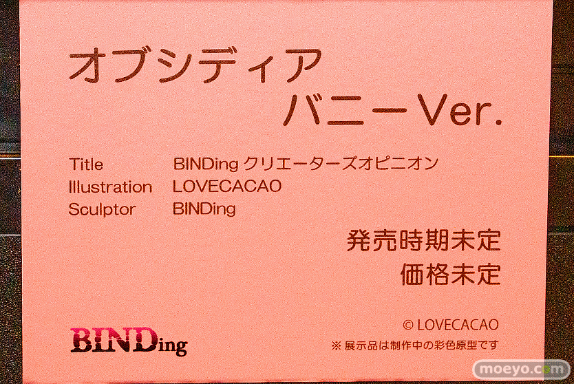 BINDing「BINDing クリエイターズオピニオン オブシディア バニーVer.」(製作中彩色原型) *掲載の展示アイテムは原則的に監修中や製作中のものとなります。 実際の商品とは若干異なる場合がございますので、予めご了承ください。 撮影:いつもの友人/もんぷち。 文:もんぷち。 関連 ■ワンダーフェスティバル2026 [冬] の記事一覧 ■ワンダーフェスティバル ■BINDing © LOVECACAO
