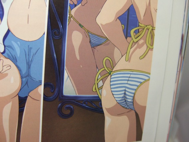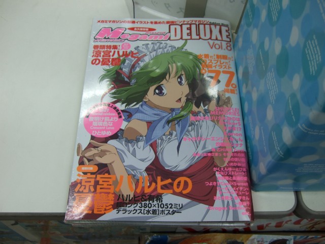3月22日、「Megami MAGAZINE DELUXE(メガミマガジン デラックス) Vol.8」(AA)が発売されました。これは「メガミマガジンとアニメディアの描きおろしイラストから厳選したスペシャル美少女ビジュアル集」というもの。今回は、縞々水着ハルヒ&水着長門の380x1052mmの「ほぼ」等身大リバーシブルポスターが付属していて、ゲーマーズ本店では、ハルヒ面のサンプルを掲示。