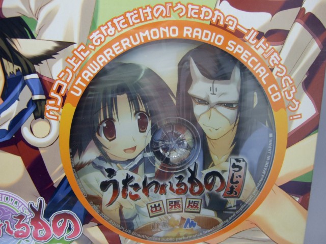 両端の画像に写っているCDが、AQUAPLUS公式ページの説明によると「小山力也(ハクオロ役)・柚木涼香(エルルゥ役)とお馴染みのパーソナリティーお二人に、スペシャルゲストを迎えた、全編録り下ろしの豪華特典CD!また、ボーナストラックとして、小山剛志(クロウ役)による「真・うたわれるもののテーマ」を収録!」という、「うたわれるものらじお」の特別盤CD。スペシャルゲストは浪川大輔氏(ベナウィ役)。