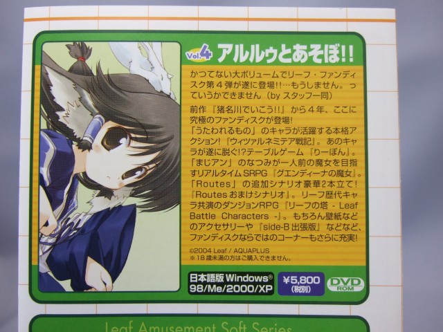 また、ソフトに同梱されていたチラシによると、リーフ・ファンディスク第4弾として「アルルゥとあそぼ!!」(AA)の発売が予定されているみたいです。