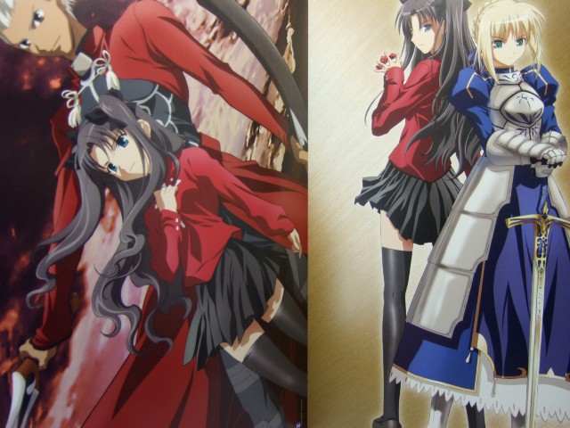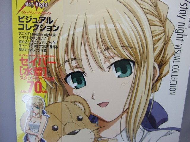 3月27日、「Fate/Stay Night ビジュアルコレクション」(AA)が発売されました。コレは、アニメ「Fate/stay night」の、アニメ誌などで掲載されたイラストを、切り離して飾ることが可能なA4サイズの「カードブック」にしたものと、アニメ版のキャラデザをされた、石原恵氏描き下ろしの「約70cm特大水着セイバーPOP」がセットになったもの。アニメ版イラストの水着姿は多分始めて。