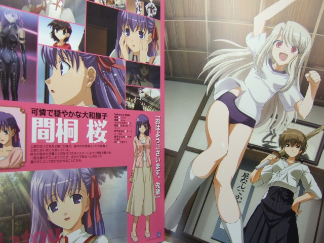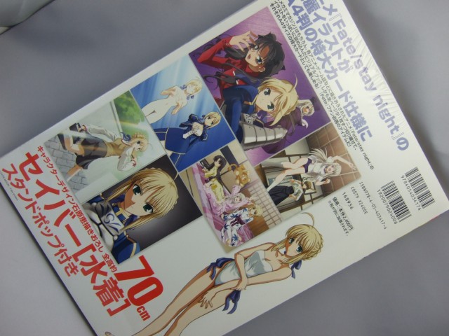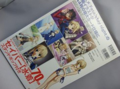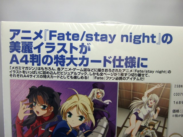 これは、裏表紙の商品説明によると「アニメ『Fate/stay night』の美麗イラストがA4判の特大カード仕様に 「メガミマガジン」はもちろん、各アニメ・ゲーム誌などに描きおろされたアニメ『Fate/stay night』のイラストをいっぱいに詰め込んだビジュアルブック。しかも全ページが一枚ずつ切り離せて、それぞれA4サイズの特大カードとしても楽しめる!『Fate』ファン必携のアイテムだ!」と紹介されているもので、アニメ版のキャラデザをされた、石原恵氏描き下ろしの「約70cm特大水着セイバーPOP」とセットになったものです。