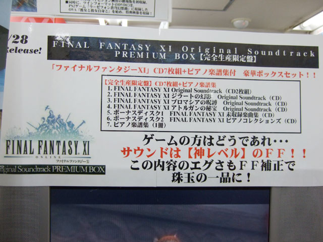 ゲームシティのPOPによると「FFXIの音源の全てが詰まったプレミアムBOX。仮想世界(ヴァナディール)では英雄のみなさんは是非に!!