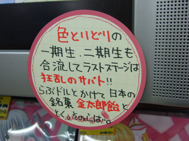 ゲームシティのPOPでは「色とりどりの一期生、二期生も合流してラストステージは狂乱のサバト!!らぶドルとかけて日本の銘菓金太郎飴ととく。その心は・・・。」「グッバイ。らぶドル -キミらの事は1ヶ月は忘れない-」等とかかれていました。
