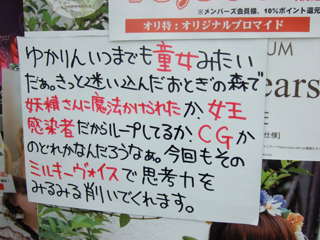 ゲームシティのPOPによると「ゆかりんいつまでも童女みたいだぁ。きっと迷い込んだおとぎの森で妖精さんに魔法かけられたか、女王感染者だからループしてるのか、CGかのどれかなんだろうなぁ。今回もそのミルキーヴォイスで思考力をみるみる削いでくれます。」とのことです。