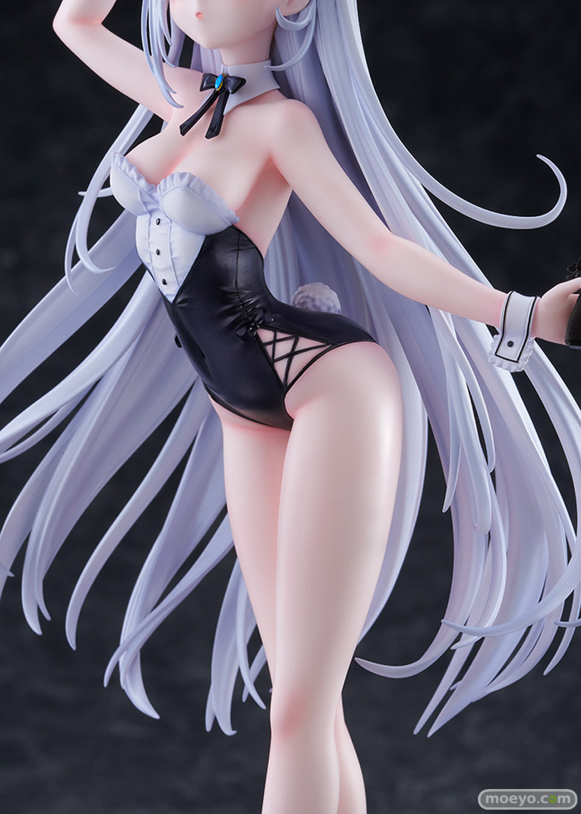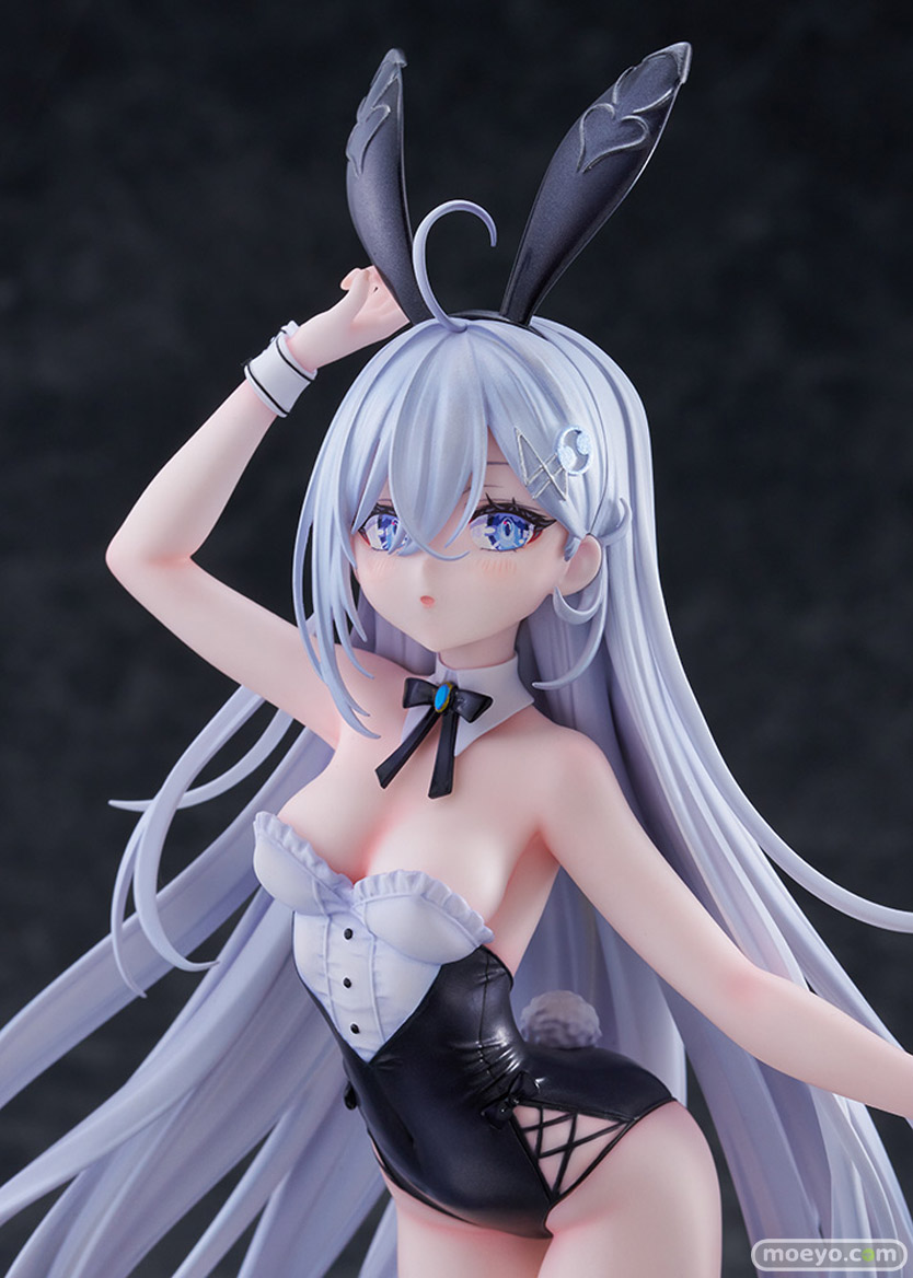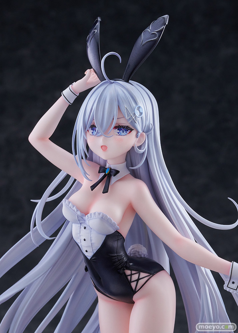 このフィギュアのために描き下ろされたイラストをもとに、バニー耳を気にしてそっとつまみ、ほんのりと頬を染めながらこちらを見つめる青い瞳や