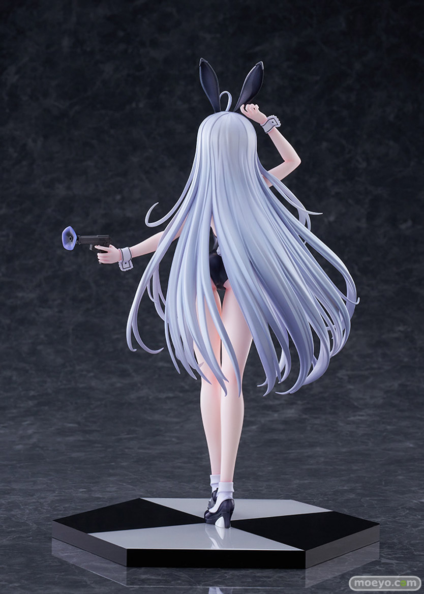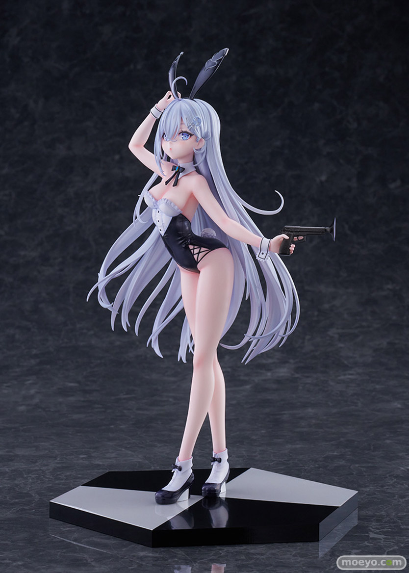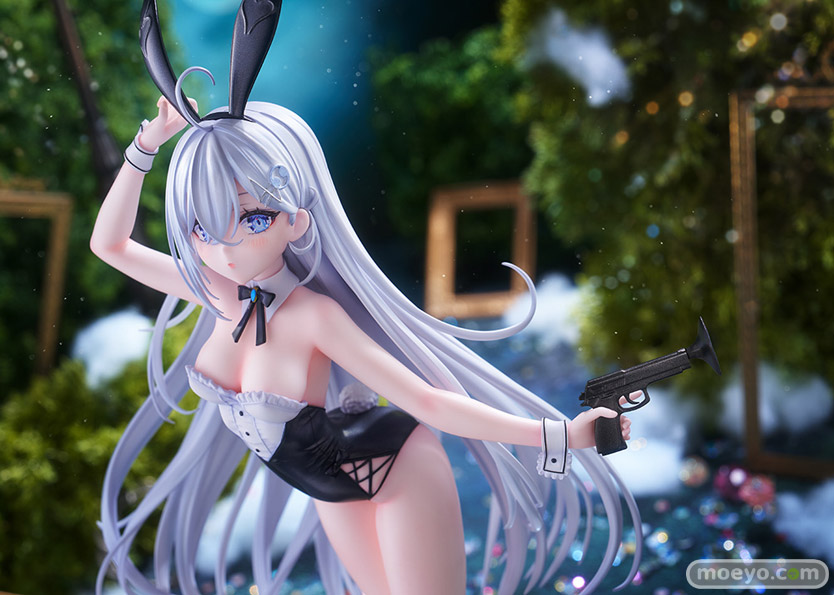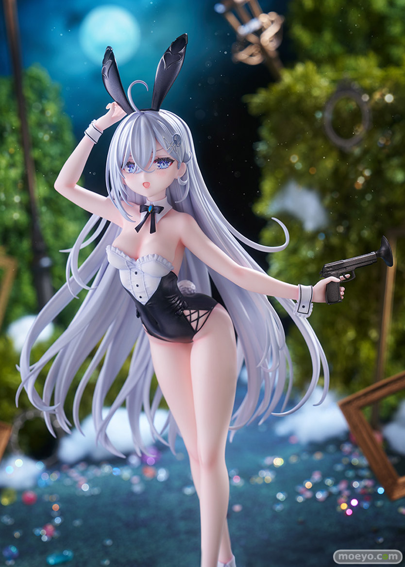 このフィギュアのために描き下ろされたイラストをもとに、バニー耳を気にしてそっとつまみ、ほんのりと頬を染めながらこちらを見つめる青い瞳や
