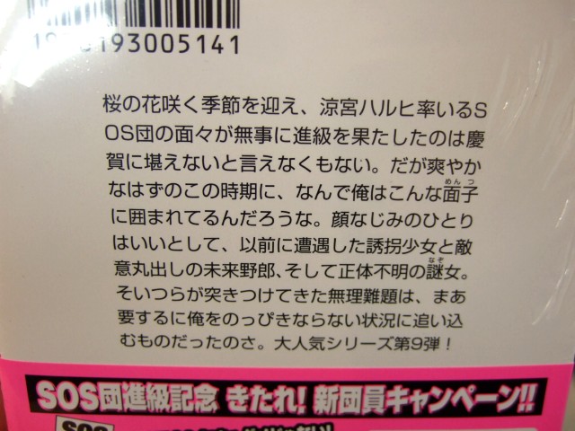 裏表紙によると「花の咲く季節を迎え、涼宮ハルヒ率いるSOS団の面々が無事に進級を果たしたのは慶賀に堪えないと言えなくもない。だが爽やかなはずのこの時期に、なんで俺はこんな面子に囲まれてるんだろうな。顔なじみのひとりはいいとして、以前に遭遇した誘拐少女と敵意丸出しの未来野郎、そして正体不明の謎女。そいつらが突きつけてきた無理難題は、まあ要するに俺をのっぴきならない状況に追い込むものだったのさ。大人気シリーズ第9弾!」という、ハルヒたちが2年生になった話となっています。