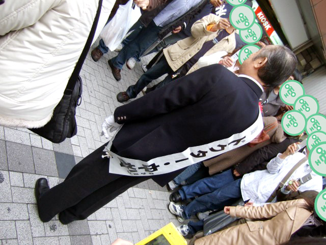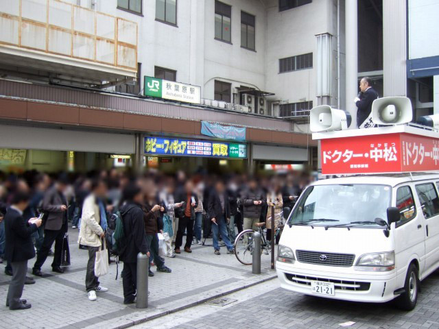 秋葉原blogさんによると、25日に秋葉原駅前に降臨していたという、都知事に立候補したドクター中松氏が、31日にもアキバに降臨されていました。25日にもメイド3人を引き連れて秋葉原駅前で演説をされていたみたいですが、31日にも演説を行い、その後下に降りられ、カメラや携帯を持った人々に囲まれながら、一人一人と握手をし、記念撮影などにも応じていました。