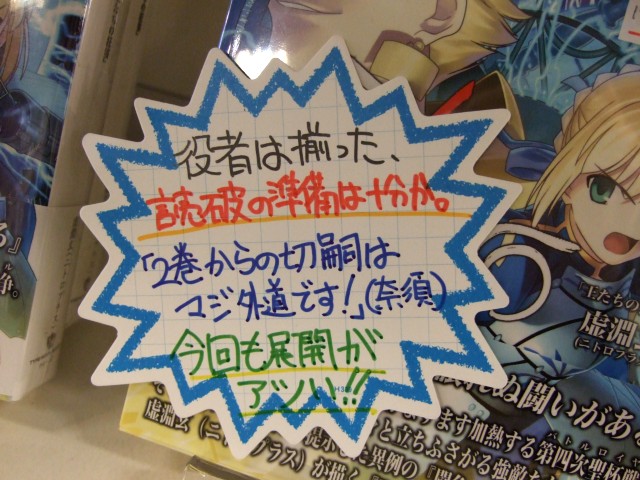 メッセ3号店では、「二巻からの切嗣はマジ外道です!」という、奈須きのこ氏のコメントをPOPに用い「役者は揃った、読破の準備は十分か。 今回も展開がアツい!!」等とされていました。