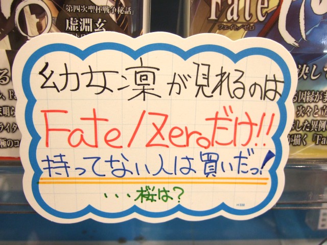 ほか、レジ前にあったPOPでは、「幼女凛が見れるのはFate/Zeroだけ!!持ってない人は買いだっ! ・・・桜は?」とも。
