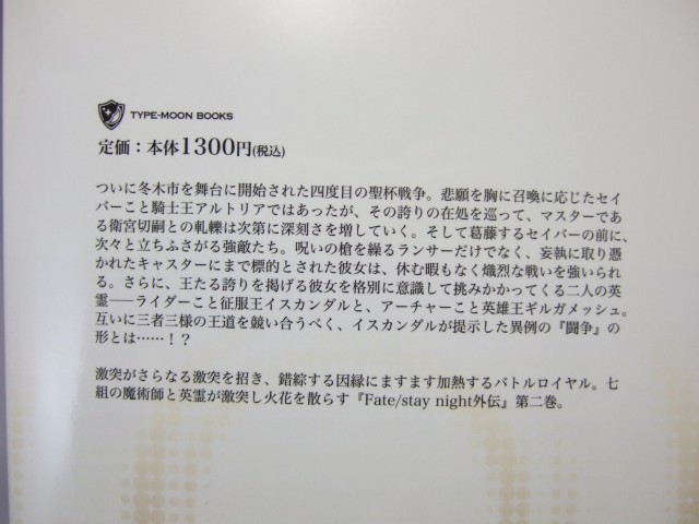 裏表紙の商品説明によると「ついに冬木市を舞台に開始された四度目の聖杯戦争。悲願を胸に召喚に応じたセイバーこと騎士王アルトリアではあったが、その誇りの在処を巡って、マスターである衛宮切嗣との軋轢は次第に深刻さを増していく。そして葛藤するセイバーの前に、次々と立ちふさがる強敵たち。呪いの槍を繰るランサーだけでなく、妄執に取り憑かれたキャスターにまで標的とされた彼女は、休む暇もなく熾烈な戦いを強いられる。さらに、王たる誇りを掲げる彼女を格別に意識して挑みかかってくる二人の英霊――ライダーこと征服王イスカンダルと、アーチャーこと英雄王ギルガメッシュ。 互いに三者三様の王道を競い合うべく、イスカンダルが提示した異例の『闘争』の形とは……!?激突がさらなる激突を招き、錯綜する因縁にますます加熱するバトルロイヤル。七組の魔術師と英霊が激突し火花を散らす『Fate/stay night外伝』第二巻。」と紹介されています。