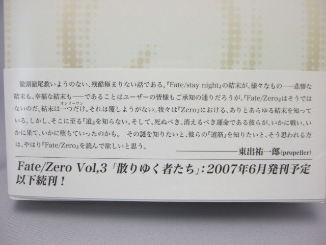 また、オビ裏面には、東出祐一郎氏の「徹頭徹尾救いようのない、残酷極まりない話である。『Fate/stay night』の結末が、様々なもの—悲惨な結末も、幸福な結末も—であることはユーザーの皆様もご承知の通りだろうが、『Fate/Zero』はそうではないのだ。結末は一つだけ。それは覆しようがない、我々は『Zero』における、ありとあらゆる結末を知っている。しかしそこに至る『道』を知らない。そして、死ぬべき消えるべき運命である彼らが、いかに戦い、いかに果て、いかに堕ちていったのかも。その謎を知りたいと、かれらの『道筋』を知りたいと、そう思われる方は、やはり『Fate/Zero』を読んでほしいと思う。」というコメントも。