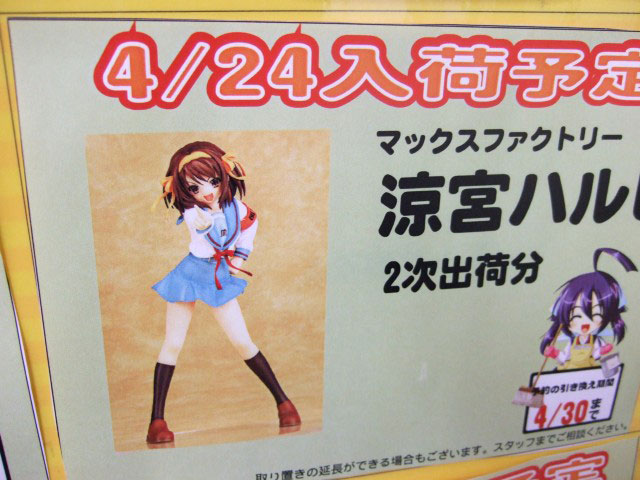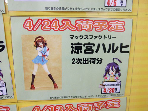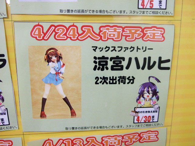 それによるとマックスファクトリー「涼宮ハルヒの憂鬱 涼宮ハルヒ 二次出荷分」は4月24日入荷予定みたいです。