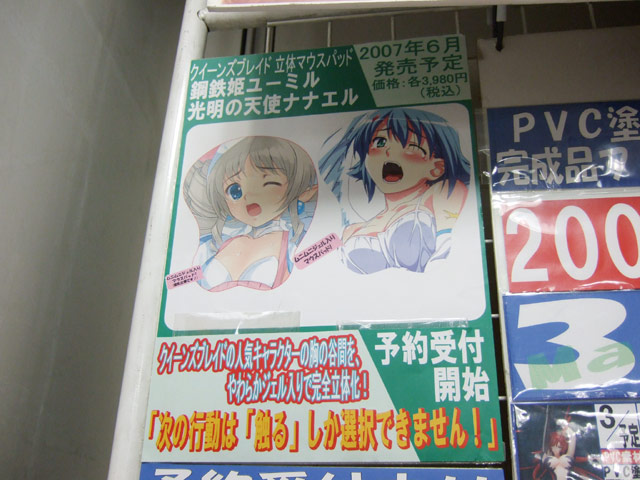 ほか、ヤマギワソフトアニメ館では、とらのあな本店で「聖乳(?)は各自でご用意ください」とされていた、クイーンズブレイド立体マウスパッドの「光明の天使ナナエル」(AM)と「鋼鉄姫ユーミル」(AM)、バンダイ「フィギュアマイスター 涼宮ハルヒの憂鬱」(AA)等の予約受付も開始していました。