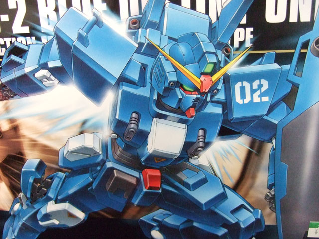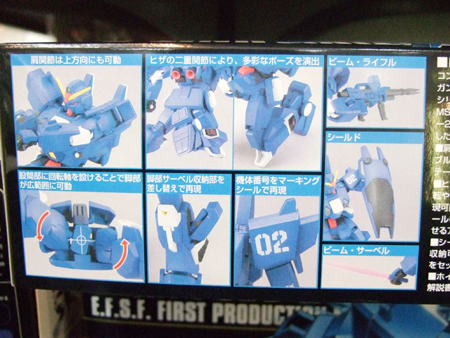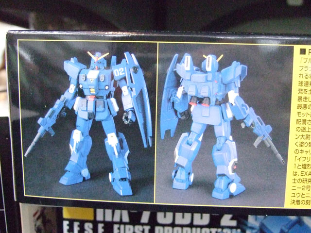これは、宮沢模型展示会2007年春のバンダイブースにてサンプル展示もあった、Wikipediaによると「セガサターンのゲーム『機動戦士ガンダム外伝 THE BLUE DESTINY』に登場する、地球連邦軍の試作型モビルスーツ」とされ、パッケ側面によると「ジオン公国のフラナガン機関から、『EXAMシステム』と呼ばれる特殊なMS制御技術とデバイスを携えて地球連邦に亡命したクルスト・モーゼス博士が開発を主導した2機目のMSである。」という「ブルーディスティニー 2号機」をプラモで立体化したもの。