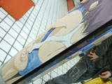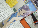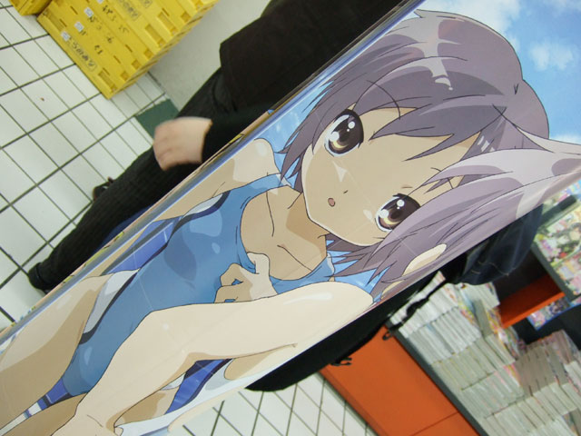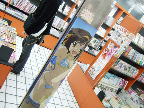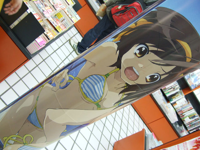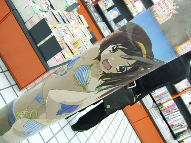 とらのあな1号店では、先日発売をお伝えした、「Megami MAGAZINE DELUXE(メガミマガジン デラックス) Vol.8」(AA)に付属する「縞々水着ハルヒ&水着長門リバーシブルポスター」を柱に貼り付けた展示がされています。その上部にあったPOPには「抱きつかないで!やぶれちゃう!! 夢が・・・色々な意味で・・・」とのこと。実際抱きついている方は見かけませんでした・・・w