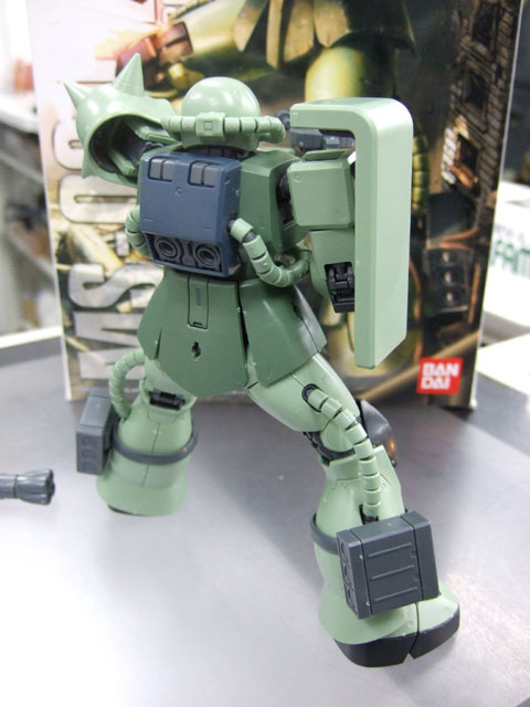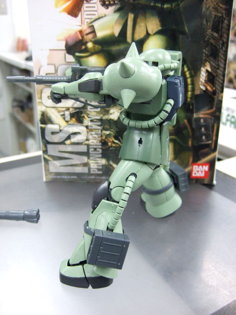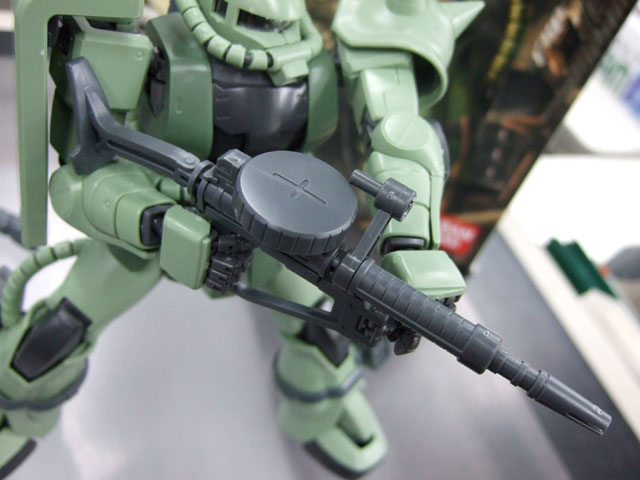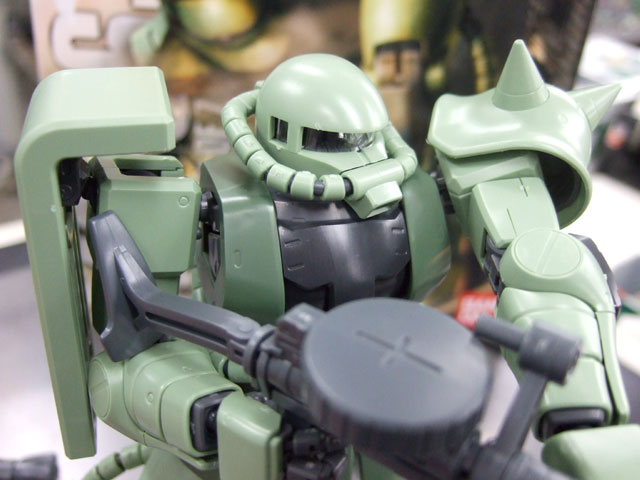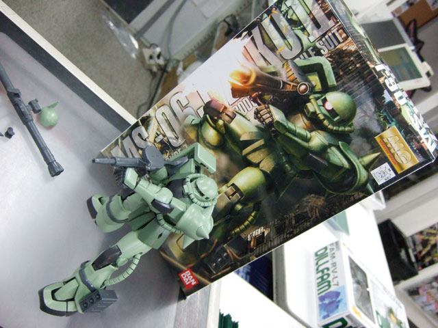 キャラシティにて、以前お伝えした新作情報によると4月発売予定の、バンダイ「MG MS-06J 量産型ザク Ver.2.0」(AM)のサンプルが届いたみたいで、展示の準備をされていました。