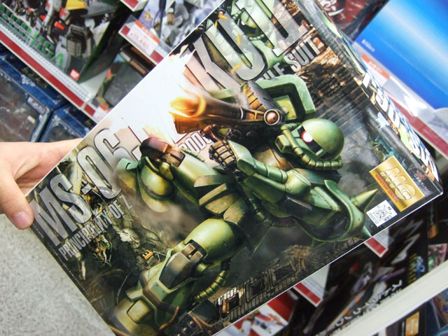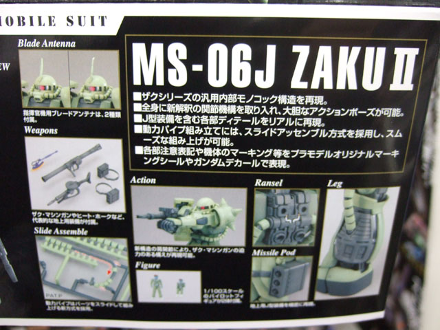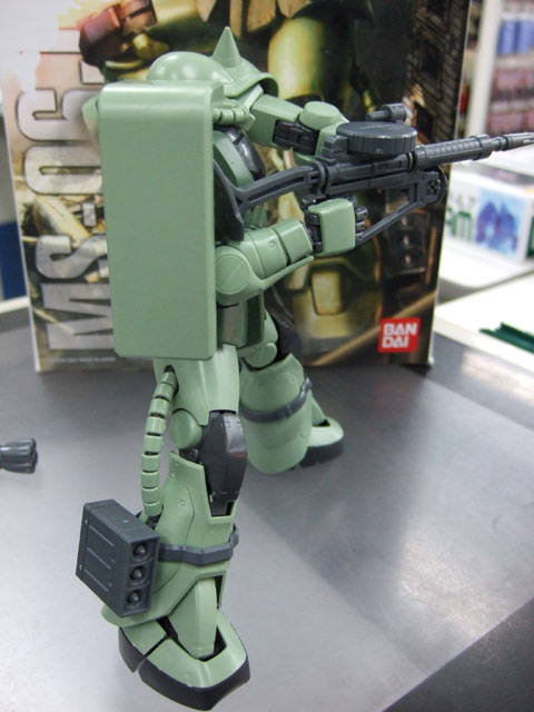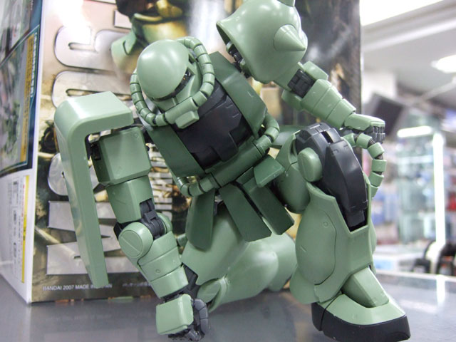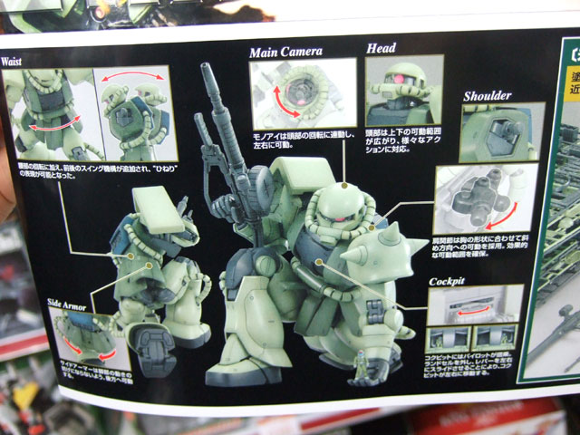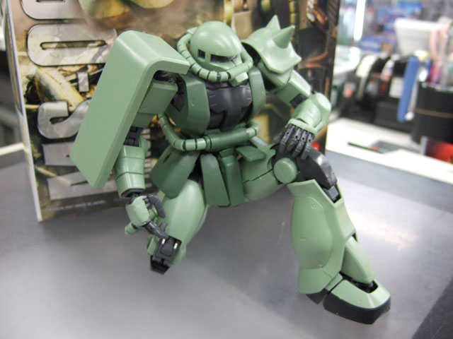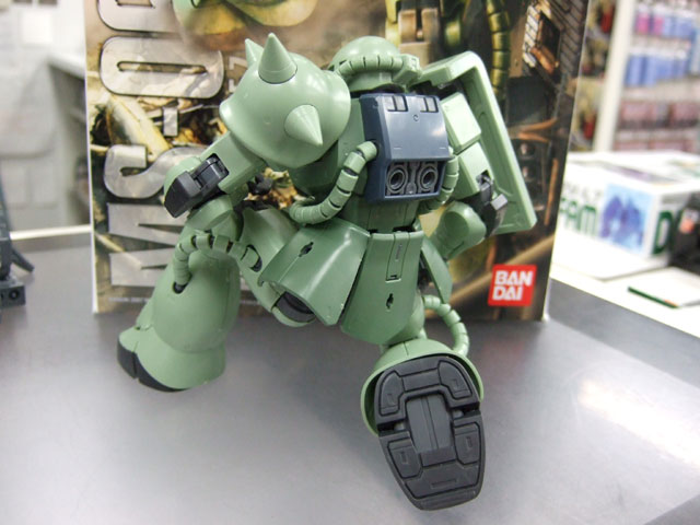 キャラシティにて、以前お伝えした新作情報によると4月発売予定の、バンダイ「MG MS-06J 量産型ザク Ver.2.0」(AM)のサンプルが届いたみたいで、展示の準備をされていました。パンフやパッケによると、”ねじれ”や可動リンクにより、今までのザクではありえない立てひざポーズが可能みたいなので、試させていただいたところ、実際余裕で出来ましたw すごいなこれw