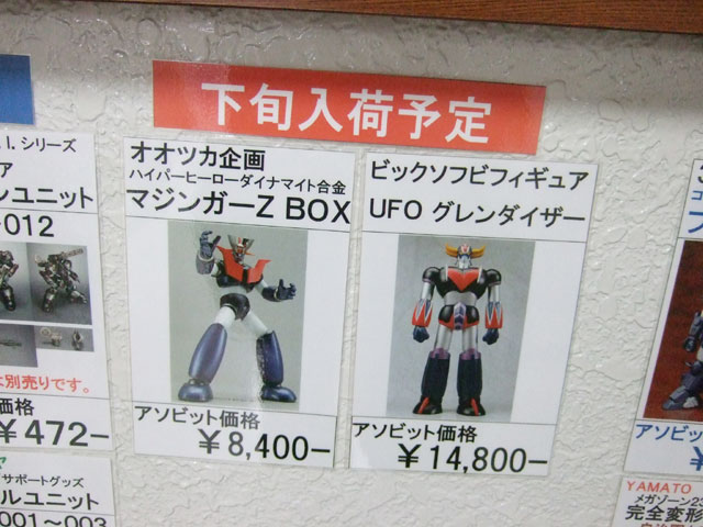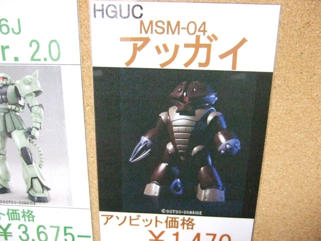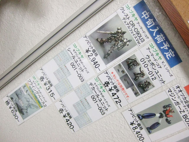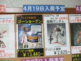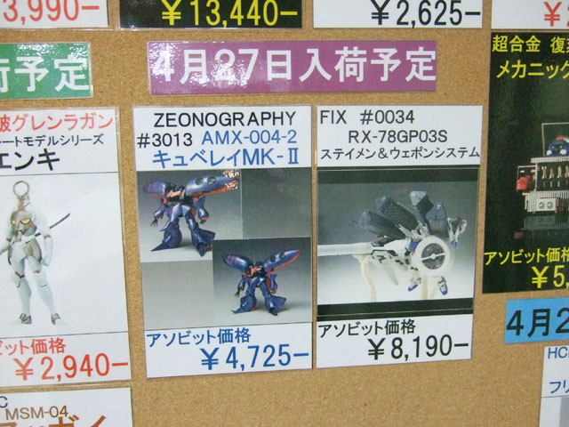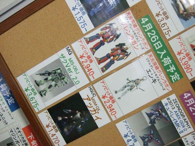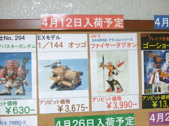 3月31日に移転オープンしたキャラシティ2Fにて、以前と変わらずバンダイ関係+αの入荷予定一覧表が掲示開始していました。それによると、バンダイ「HGUC アッガイ」(AA)は26日頃入荷予定みたい。他、バンダイ「HCM-Pro38 陸戦型ガンダム」(AA)、「EMIA シャア専用ゲルググ」(AM)、シーエムズ「BRAVE合金 戦国魔神 ゴーショーグン」(AM)などの入荷予定日をまとめて。