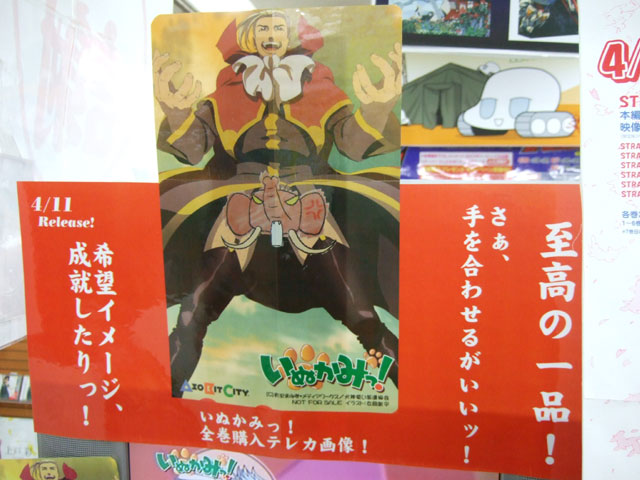 4月10日、DVD「いぬかみっ! VOL9っ!! =特装版=」(AA)が発売されました。これは、アニメ「いぬかみっ!」のDVD最終巻となるもので「煩悩・逆セクハラ・教育問題(保健体育)について考えさせられる教育アニメ」や「ス○トロプレイ収録」等としていたゲームシティでは、POPによると「男性器(シンボル)のみを強調したテレカ」という、全巻購入特典テレカの絵柄も公開していました。