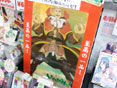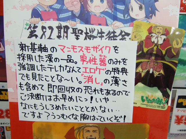 その「全巻購入テレカ」の絵柄は、殴り書きPOPによると「新基軸のマンモスモザイクを採用した漢の一品。男性器(シンボル)のみを強調したテレカなんてエロゲの特典でも見たことな〜い。「消し」の薄さも含めて、即回収の恐れもあるのでご決断はお早めにっ!いや…なにもうしろめたいとか、ない…ですよ?うつむくな、胸はっていくぞ!」という、6巻のジャケットイラストにいた、Wikipediaによると「いわゆる究極のヘンタイであり、自らの理想郷たる全ての欲望が肯定される場所「賢者の楽園」(啓太曰く「ヘンタイパラダイス」)をこの世に構築する事を目指している。」という、「裸王」こと赤道斎(DV:若本規夫氏)のイラスト。
