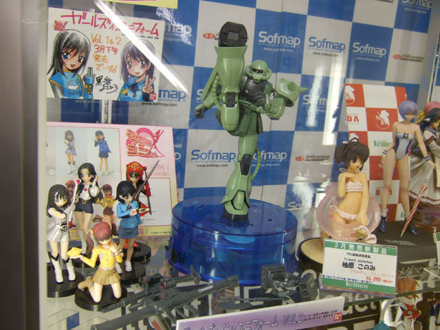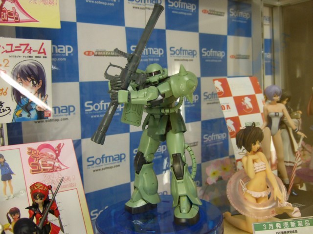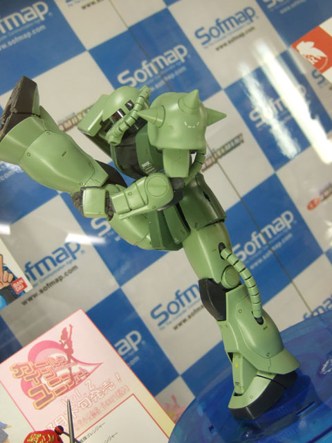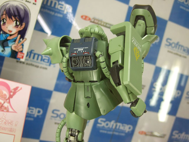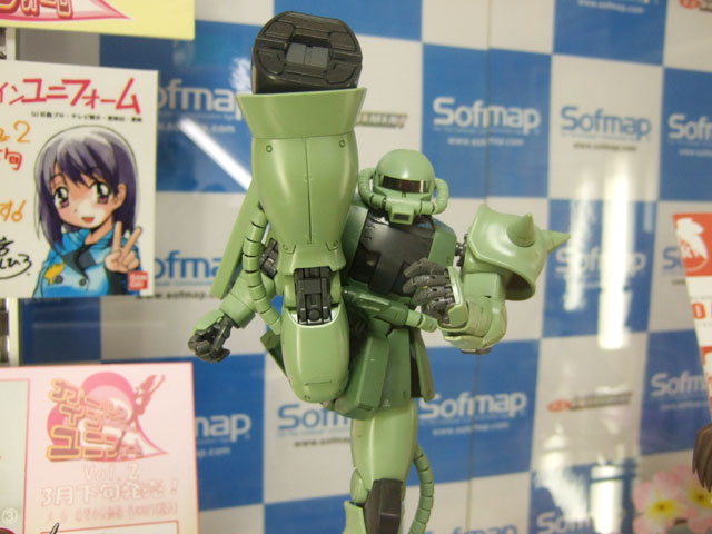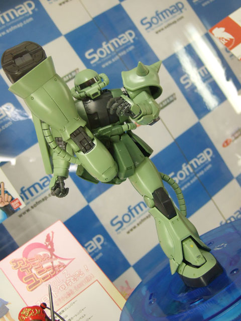 キャラシティでのサンプルを以前お伝えしたことのある、バンダイMG MS-06J 量産型ザク Ver.2.0」(AM)のサンプル展示が、ソフマップ本店でも開始されていました。