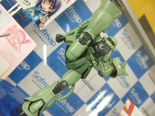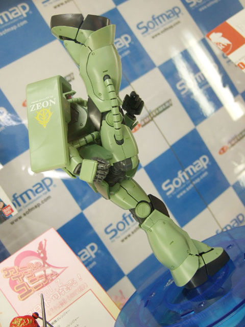 キャラシティでのサンプルを以前お伝えしたことのある、バンダイMG MS-06J 量産型ザク Ver.2.0」(AM)のサンプル展示が、ソフマップ本店でも開始されていました。展示されていたサンプルは、片足を大きく上げて、まるでテコンドーのネリチャギのようなポーズとなっていました。店員さんに伺ったところ「テープで簡単に(足底を)止めているだけですよ」とのことでした。