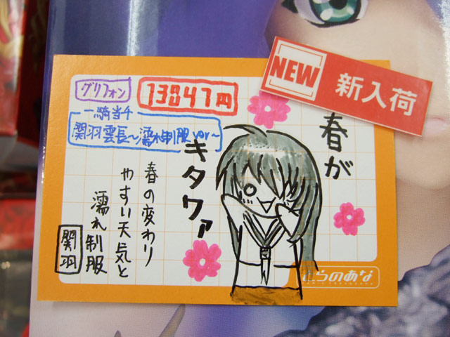 ほか、11日に入荷確認出来たのは、ヤマギワソフトアニメ館、本店、「春がキタワァ 春の変わりやすい天気と濡れ制服。関羽」というPOPのあった、とらのあな本店、コトブキヤ秋葉原店などでした。
