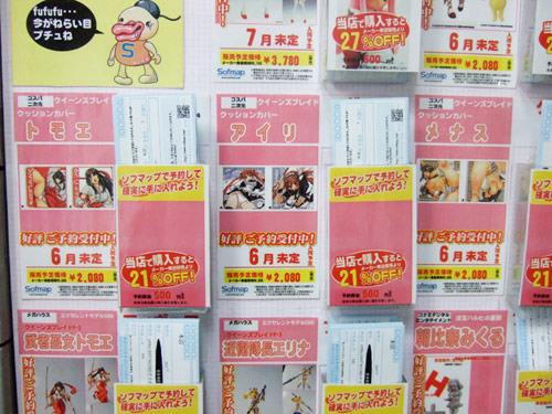 ソフマップ本店、1号店にて、コスパ クイーンズブレイド クッションカバー「トモエ」(AA)、「アイリ」(AA)、「メナス」(AA)の予約受付が開始していました。これは、絵柄がこんなのやこんなのやこんなのなクッションカバーで、公式の商品説明によると「貴方の部屋の中を美闘士達が彩ります。」とされ、メナスの商品説明では、「メナスをノックダウンさせてあげたいあなたの部屋に是非!」