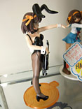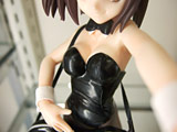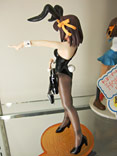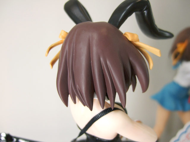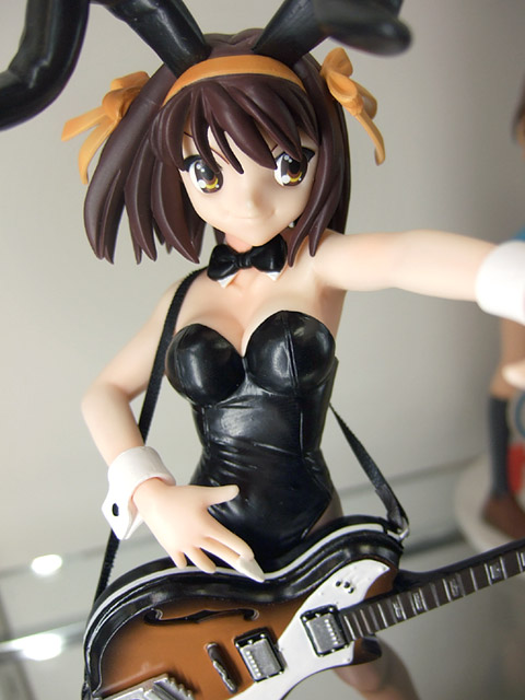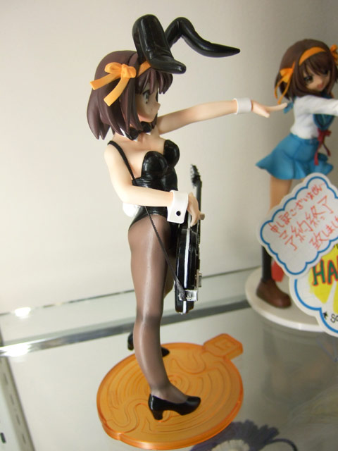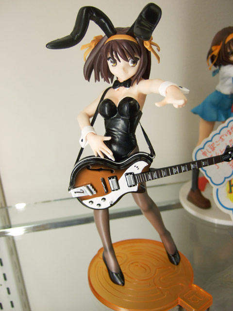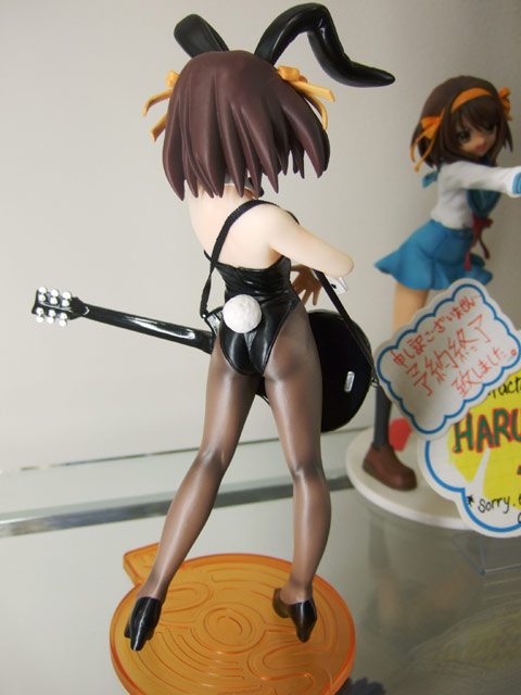 これは、宮沢模型展示会2007春でもサンプル展示されていたアニメ「涼宮ハルヒの憂鬱」の「ライブアライブ」でのバニー姿のハルヒを立体化したもので、あみあみの商品説明によると「話題沸騰「涼宮ハルヒの憂鬱」より主役のハルヒがライブで見せたバニーガールスタイルで登場。表情仕草など「ハルヒらしさ」にこだわった造型をぜひ手にとって確かめてください!クリアーオレンジの「SOS団」デザイン台座付き。」と紹介されています。