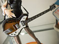 右手にはピック。ギターの肩ヒモは、本物のヒモで出来ているので、ある程度とり回しが自由に出来るみたいです。