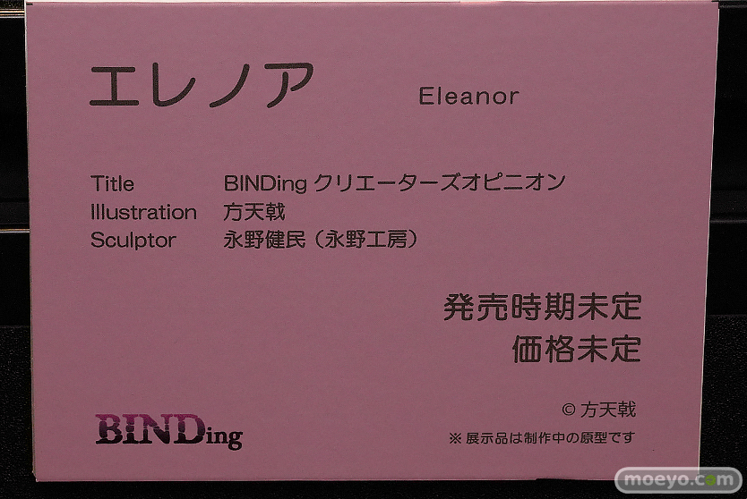 BINDing「BINDing クリエーターズオピニオン エレノア」(制作中原型) *掲載の展示アイテムは原則的に監修中や製作中のものとなります。 実際の商品とは若干異なる場合がございますので、予めご了承ください。 撮影:いつもの友人/もんぷち。 文:もんぷち。 関連 ■「第13回 ネイティブグループ合同展示会(エロホビ)」の記事一覧 ■BINDing ■ネイティブ © 方天戟