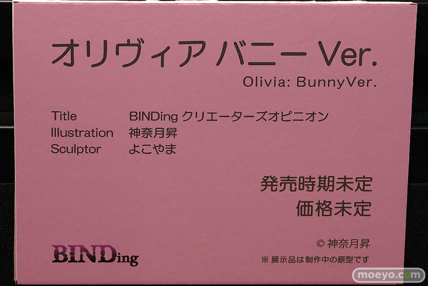 BINDing「BINDing クリエーターズオピニオン オリヴィア バニーVer.」(制作中原型) *掲載の展示アイテムは原則的に監修中や製作中のものとなります。 実際の商品とは若干異なる場合がございますので、予めご了承ください。 撮影:いつもの友人/もんぷち。 文:もんぷち。 関連 ■「第13回 ネイティブグループ合同展示会(エロホビ)」の記事一覧 ■BINDing ■ネイティブ © 神無月昇