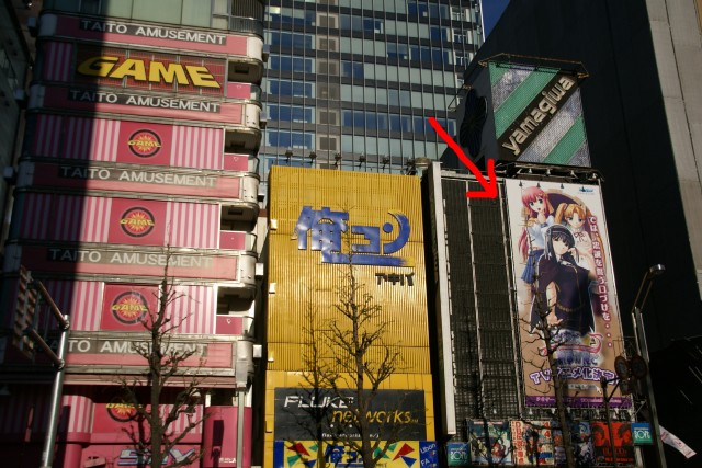 ヤマギワソフトアニメ館の外壁に、WEB体験版も公開された、5月25日発売予定のみなとそふと君が主で執事が俺で」(AA)の巨大POPが掲示されていることに気がつきました。アキバでは以前むねぽちをライトアップしていたこととかはありますが、エロゲでココまで巨大なPOPの掲示はあまり見かけないかなと。POPは本当にでかく、どのくらい巨大かというと、このくらい
