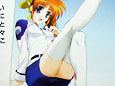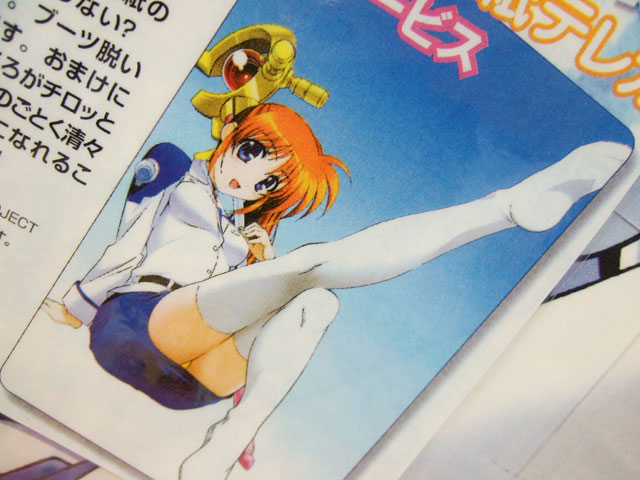 横に書かれた解説で「表紙に初登場のなのはがテレカに! …でもちょっと待て。表紙の絵とか何か違わない?そうです。ブーツ脱いでるんです。おまけに大事なところがチロッと…♥ 春風のどとく清々しい気持ちになれるこの一枚、ぜひ!」と紹介されているように、表紙では文字で隠れている部分が、テレカ画像サンプルだと全開となっていましたw
