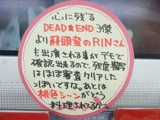 ゲームシティでは垂れ幕に「おまえらなぁ、このお曲は黙って背中で聴くのみだ!」としてアーチャーのせなかの画像を掲載していたほか、POPでは「心に残るDEAD★END3傑より飛頭蛮のRINさんも出演される事がデモで確認出来るので、残虐描写はほぼ審査クリアしたっぽいですな。あとは桃色シーンがどう料理されてるか・・。」と、PS2版への移植への店員さんのコメントが。