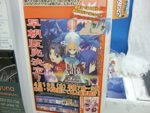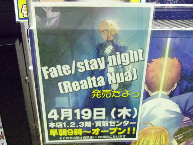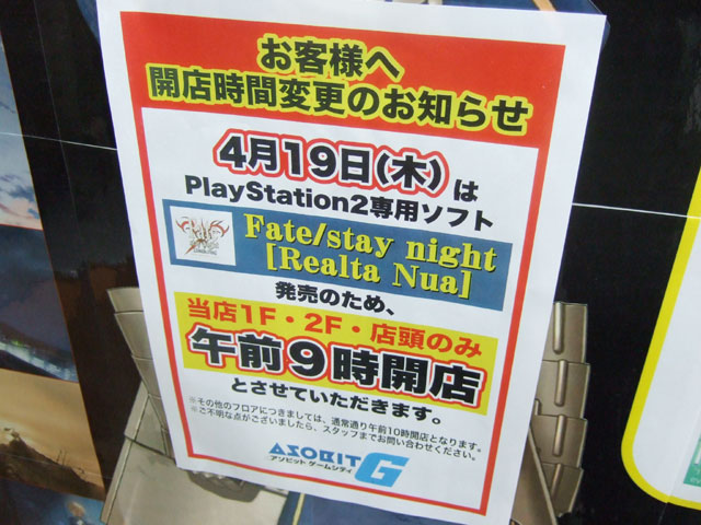 ゲームシティ、ソフマップ本店、とらのあな本店では、PS2用ソフト「フェイト/ステイナイト[レアルタ・ヌア]」(AA)の19日の発売日に早朝販売をするみたいで、それぞれのPOPによると、ゲームシティでは「1F・2F・店頭のみ午前9時開店とさせていただきます。※その他のフロアにつきましては、通常通り午前10時開店となります。」とされ、ソフマップ本店では、「本店1.2.3階 買取りセンター早朝9時オープン」で、とらのあな本店は「早朝7時〜9時本店・1号店前にて路上販売」となるみたいです。