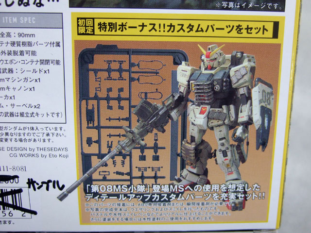 初回限定版には、「第08MS小隊」登場MSへの使用を想定したカスタムランナーパーツという、「カスタムパーツ」が同梱されていて、そのランナーパーツのサンプルも展示されていました。