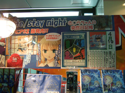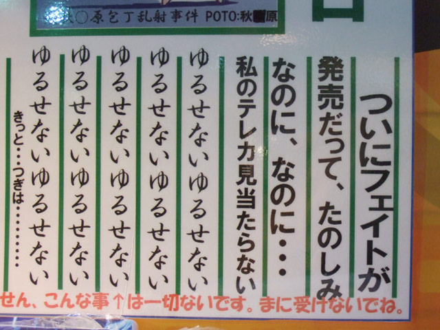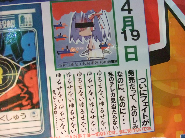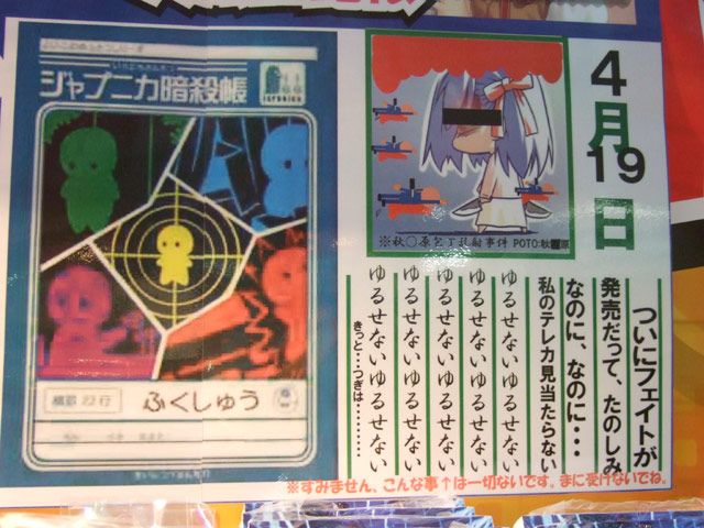 4月19日、「フェイト/ステイナイト[レアルタ・ヌア]」(AA)が正式な発売日を向かえました。移転したキャラシティでも、ゲームの取り扱いが行われているので販売していましたが、店頭には久々にジャプニカ暗殺帳が掲示され、そこには「ついにフェイトが発売だって、たのしみなのに、なのに・・・私のテレカ見当たらない」とされていました。(公式の特典テレカ一覧ページ)