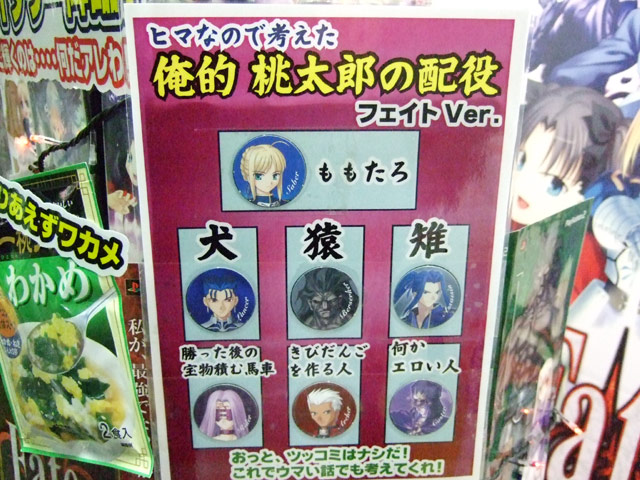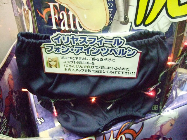 ほか、以前からあった「お登り禁止!※つい先日、金ピカの格好をした一人称が「我」と言うおかしな自称・王が、「頂点は我が、我が!」と謎の発言をしつつ登ろうとしたところを厳重注意されております。」と書かれたPOPや、「イリヤスフィール・フォンアインツベルン ※ココにネタとして飾る為だけにコスプレ屋にコレを(じゃんけんで負けて)買いにいかされた本店スタッフを皆で励ましてあげて下さい!!」と書かれたブルマなどのほか、「ヒマなので考えた俺的 桃太郎の配役 FateVer. セイバー:ももたろう、犬:ランサー、猿:バーサーカー、雉:佐々木小次郎、勝った後の宝物を積む馬車:ライダー、きびだんごをつくる人:アーチャー、何かエロい人:キャスター おっとツッコミはナシだ!これでウマい話でも考えてくれ!」というPOPや、「実際このくらいだろうと思われる等身大の凛の足 特に意味はない!」(元画像)などが追加されていました。