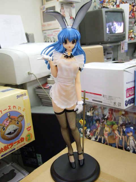 これは、必然的にローアングルで見える位置にサンプル展示もあった、山田良成氏(山田屋)原型のオリジナルキャラのガレキを、PVCフィギュアにしたもので、ダイキ工業の商品説明によると「PVCパーツをはめ込むだけで完成する塗装済組立キットです。顔や髪の毛のグラデーションなど全て塗装済です。頭部と髪の毛パーツなど一部組立済のパーツもあります。ストッキングはリアルな網タイツが付属。また、エプロンは取り外しできますので、サイズの合う布製衣装を着せる事も可能かもしれません。 エプロンは半透明成形色になります。暑さでの傾き対策に、成形樹脂は硬質なものを使用しております。」と紹介されています。